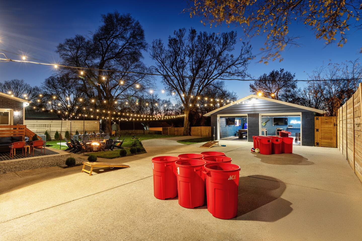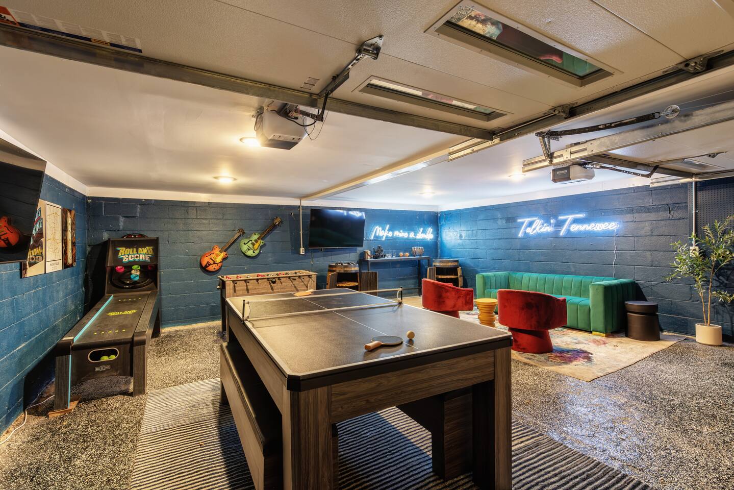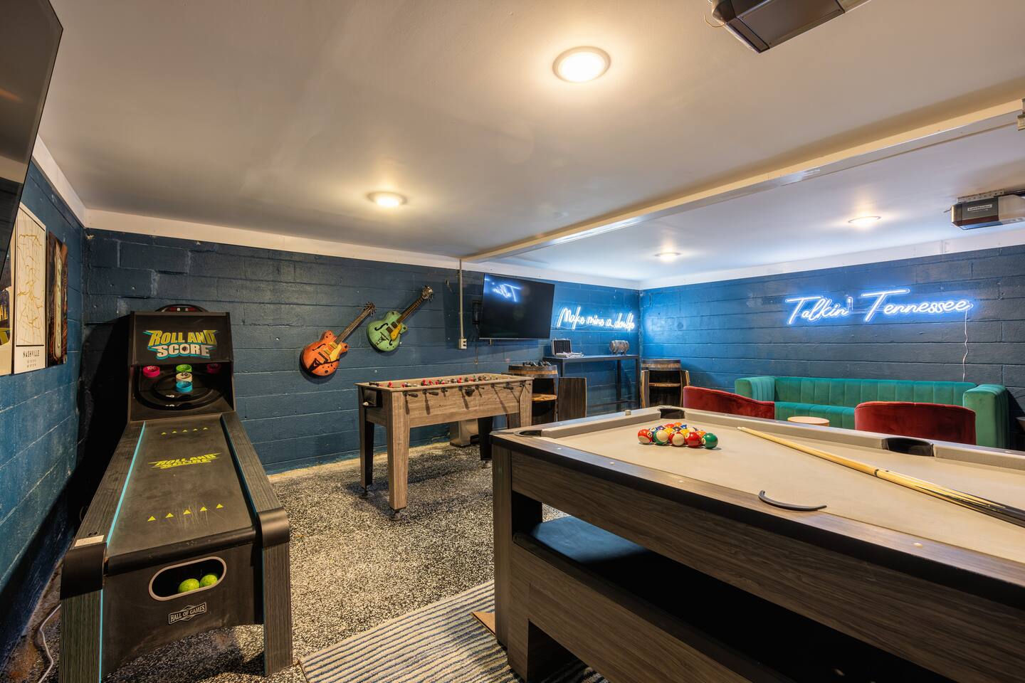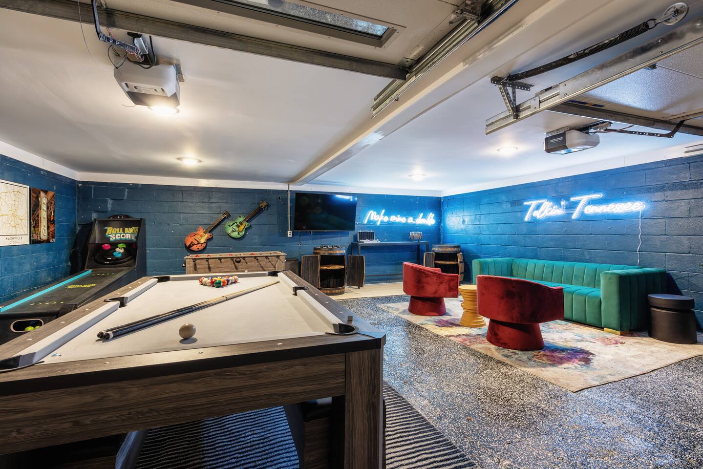 Property Highlights: - Located on 1/2 acre with ample space. - 4 bedrooms, 9 beds and 3 full bathrooms. - Living room is uniquely designed with a large L-shaped couch, dedicated bar and Smart TV. - Game room with 2 seating areas, pool table, skee-ball, foosball, ping pong, dartboard and dedicated bar area. - Fully-equipped kitchen featuring brand-new appliances and all of the essentials for cooking. Dual coffee pot and Keurig system. We provide K-pods and coffee filters. - Movie room with reclining seats, popcorn machine, HD projector, high-end sound system and karaoke machine. - Spacious backyard with a 7-person hot tub, 3 different seating areas, BBQ grill, fire pit and go-to lawn games (oversized Jenga, connect 4, cornhole and more). - Large driveway to accommodate 5 medium-sized vehicles. - High-speed internet with dedicated workspace in the master bedroom. - Full-sized washer and dryer with laundry detergent provided for your convenience. - Conveniently located and just a 10-minute drive from Nashville’s top attractions like Broadway, Five Points, Nissan Stadium, Country Music Hall of Fame, Pedestrian Bridge and Centennial Park. Sleeping Arrangements: - Primary Bedroom: California King Bed with renovated bathroom with Smart TV, dual sinks, dual shower and walk-in closet - Guest Bedroom 1: Two Queen Beds with walk-in closet, small seating area and walk-in closet - Guest Bedroom 2: Two Queen Beds with walk-in closet, small seating area and dresser - Guest Bedroom 3: Two Bunk Beds (Twin Over Twin and Full Over Full Quad Bunk Beds) with walk-in closet, Smart TV and dresser
