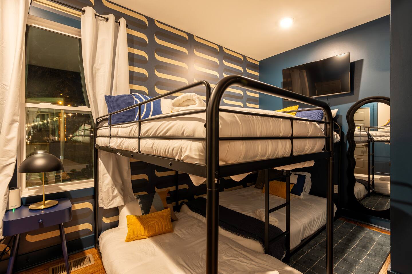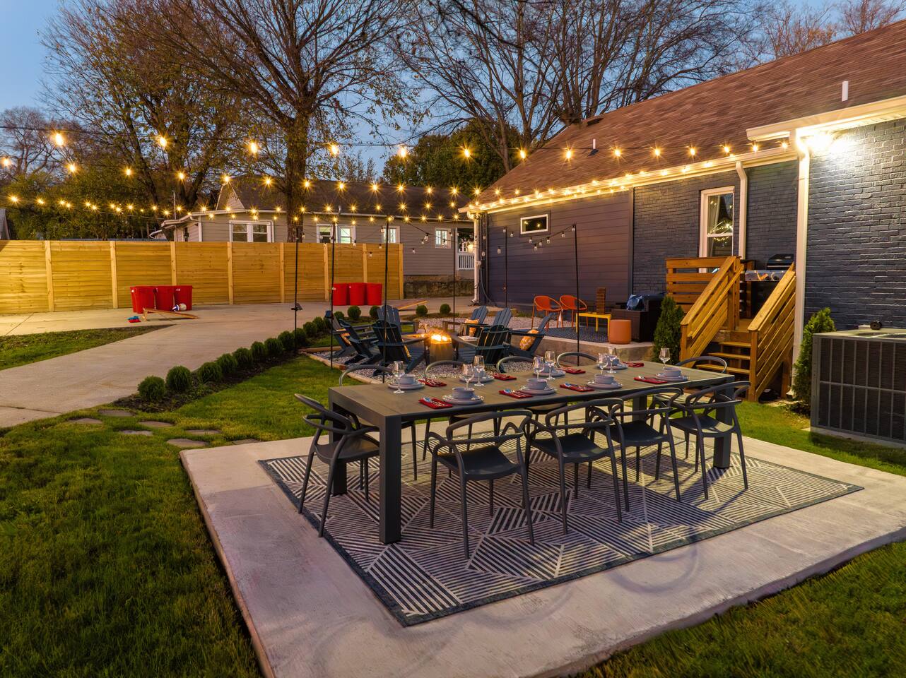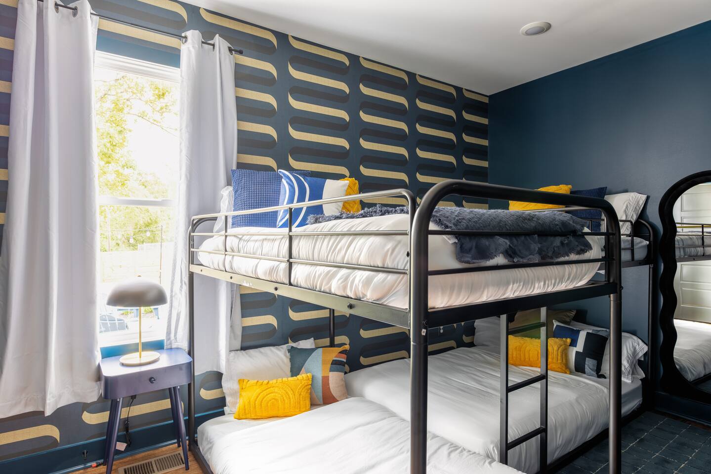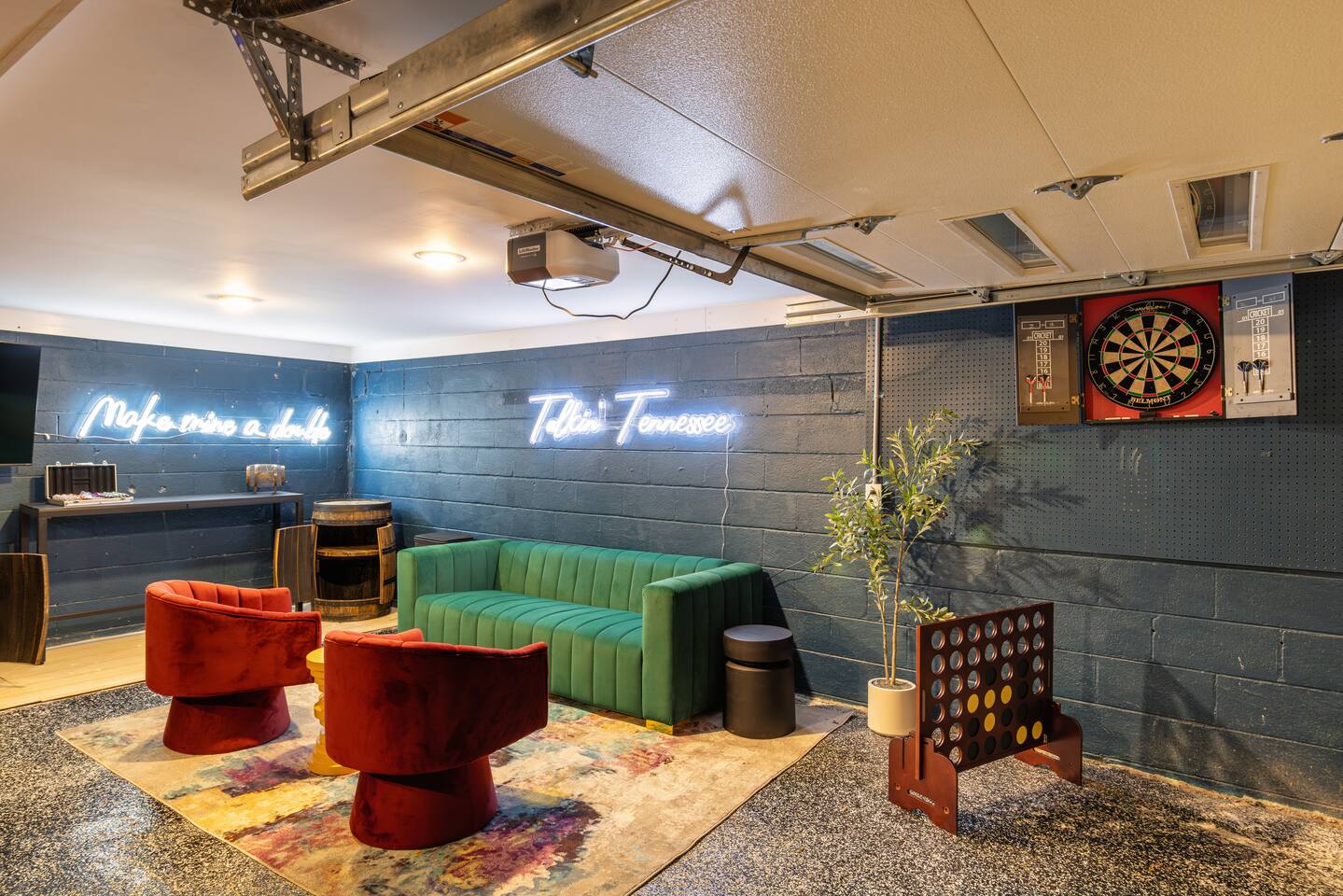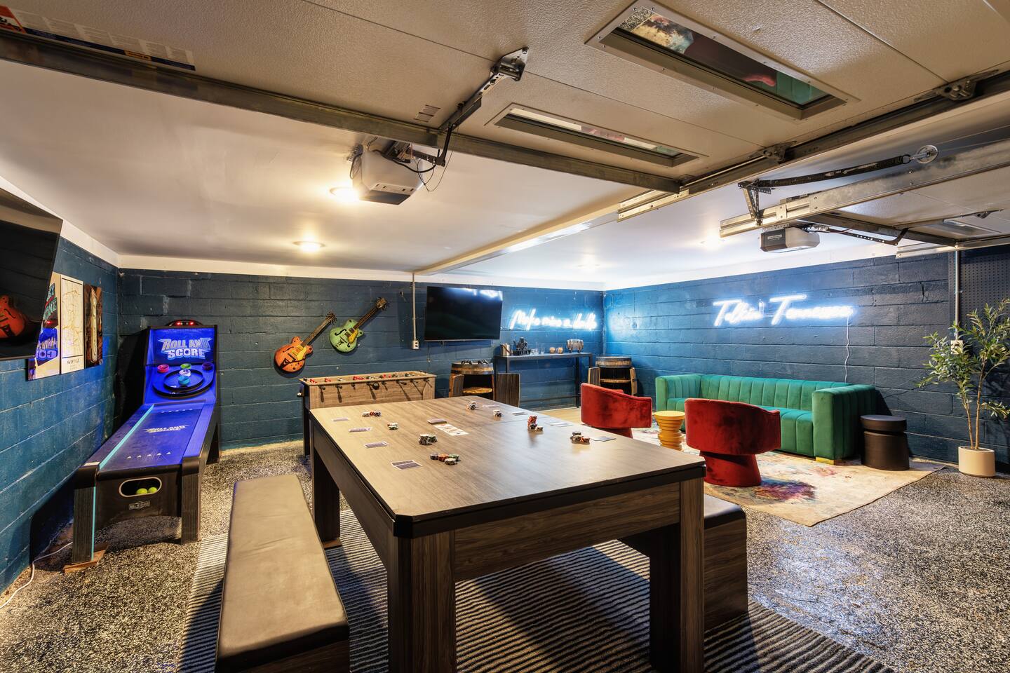 Property Highlights: - Located on 1/2 acre with ample space. - 4 bedrooms, 9 beds and 3 full bathrooms. - Living room is uniquely designed with a large L-shaped couch, dedicated bar and Smart TV. - Game room with 2 seating areas, pool table, skee-ball, foosball, ping pong, dartboard and dedicated bar area. - Fully-equipped kitchen featuring brand-new appliances and all of the essentials for cooking. Dual coffee pot and Keurig system. We provide K-pods and coffee filters. - Movie room with reclining seats, popcorn machine, HD projector, high-end sound system and karaoke machine. - Spacious backyard with a 7-person hot tub, 3 different seating areas, BBQ grill, fire pit and go-to lawn games (oversized Jenga, connect 4, cornhole and more). - Large driveway to accommodate 5 medium-sized vehicles. - High-speed internet with dedicated workspace in the master bedroom. - Full-sized washer and dryer with laundry detergent provided for your convenience. - Conveniently located and just a 10-minute drive from Nashville’s top attractions like Broadway, Five Points, Nissan Stadium, Country Music Hall of Fame, Pedestrian Bridge and Centennial Park. Sleeping Arrangements: - Primary Bedroom: California King Bed with renovated bathroom with Smart TV, dual sinks, dual shower and walk-in closet - Guest Bedroom 1: Two Queen Beds with walk-in closet, small seating area and walk-in closet - Guest Bedroom 2: Two Queen Beds with walk-in closet, small seating area and dresser - Guest Bedroom 3: Two Bunk Beds (Twin Over Twin and Full Over Full Quad Bunk Beds) with walk-in closet, Smart TV and dresser